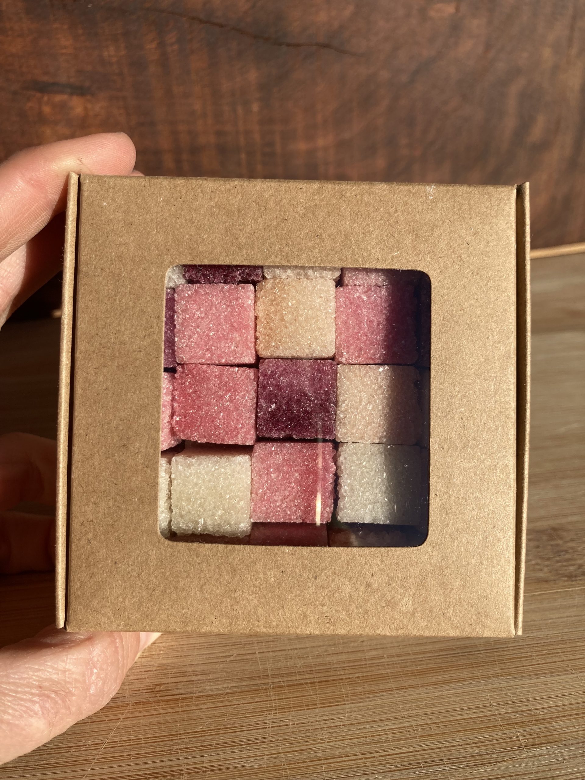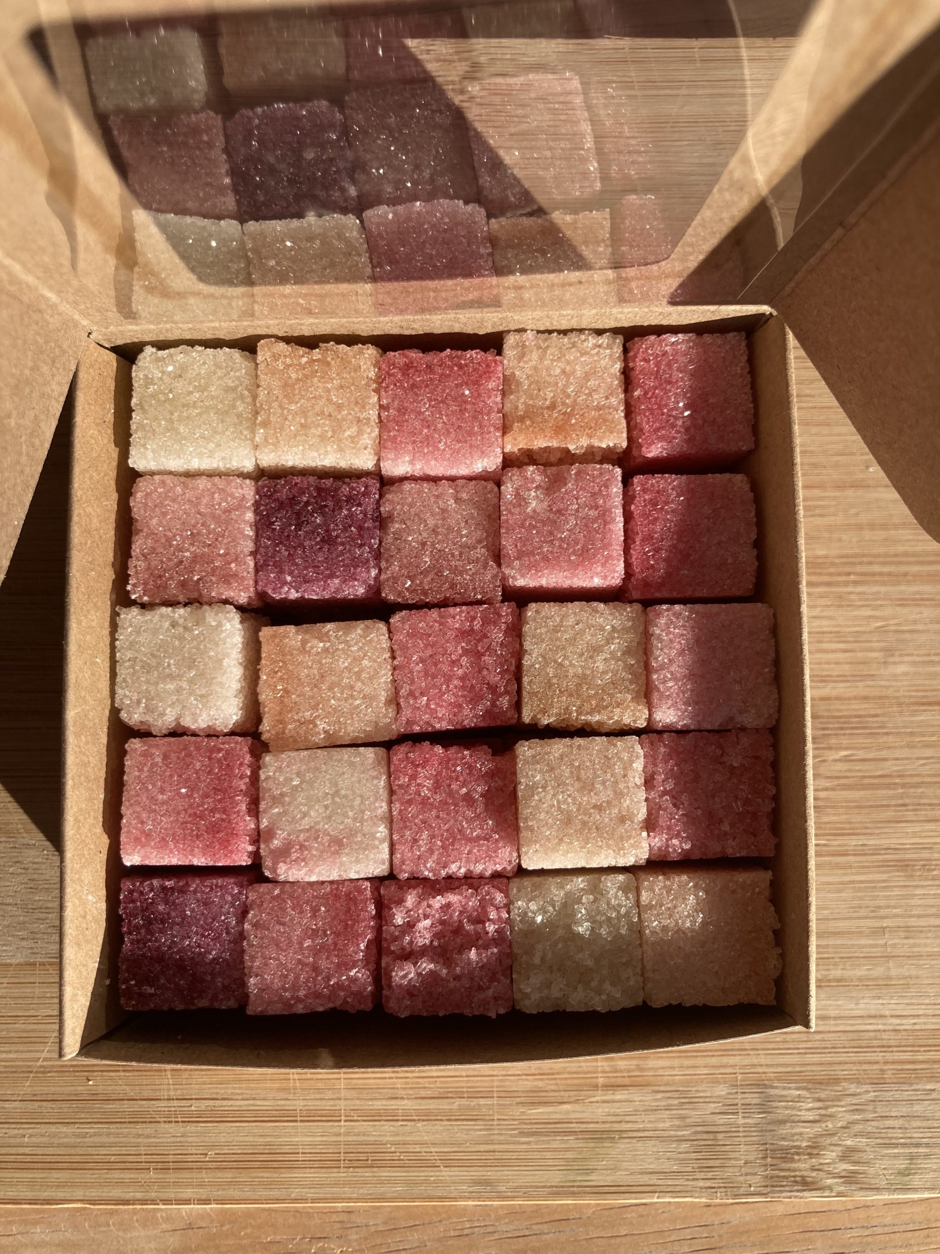 In this box of organic sugar cubes you’ll get 4 flavors: Blueberry, Strawberry, Raspberry and Pure. They are 4 beautiful colors: purple, light pink, deep pink and white. All of our organic sugar cubes are free from artificial flavors and dyes. The color of each one comes from the fruit it’s flavored with!